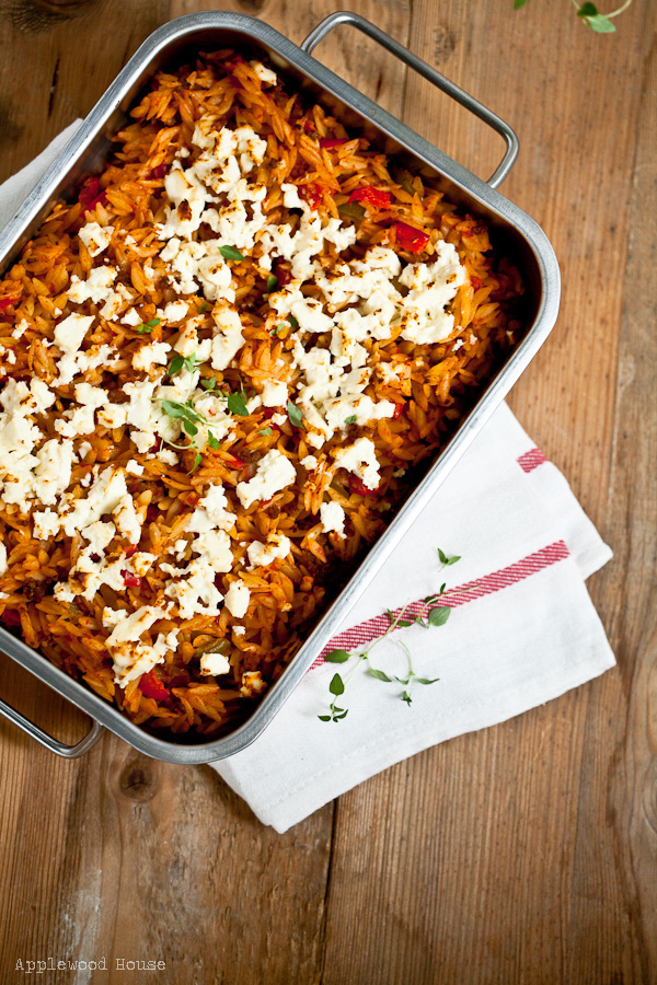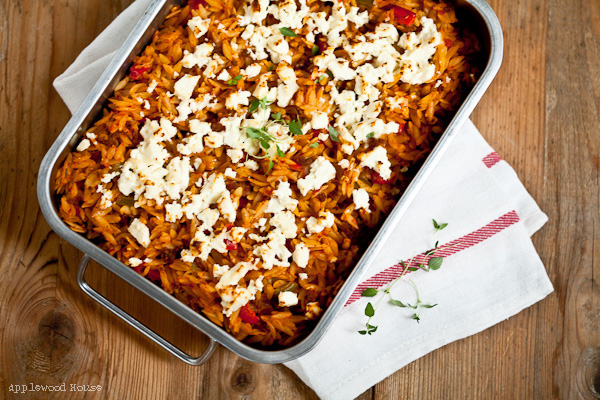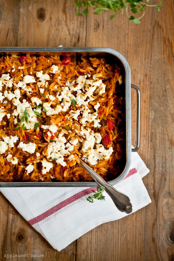 Krithiraki-Auflauf mit Ajvar-Joghurt-Sauce und Schafskäse