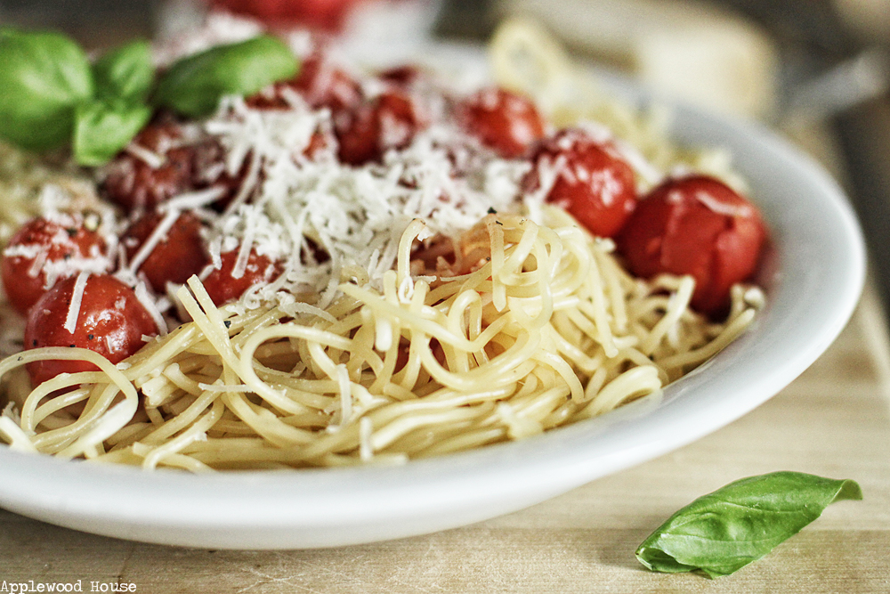 Ach, und aufpassen beim Essen! Wenn man die Kirschtomaten zu grob anpiekst spritzt es ganz schön! Also ganz vorsichtig! Und das Schöne ist: je schneller das Essen fertig auf den Tellern dampft, destso mehr Zeit bleibt zum Genießen. Und zum Tomatenspritzer wegputzen.