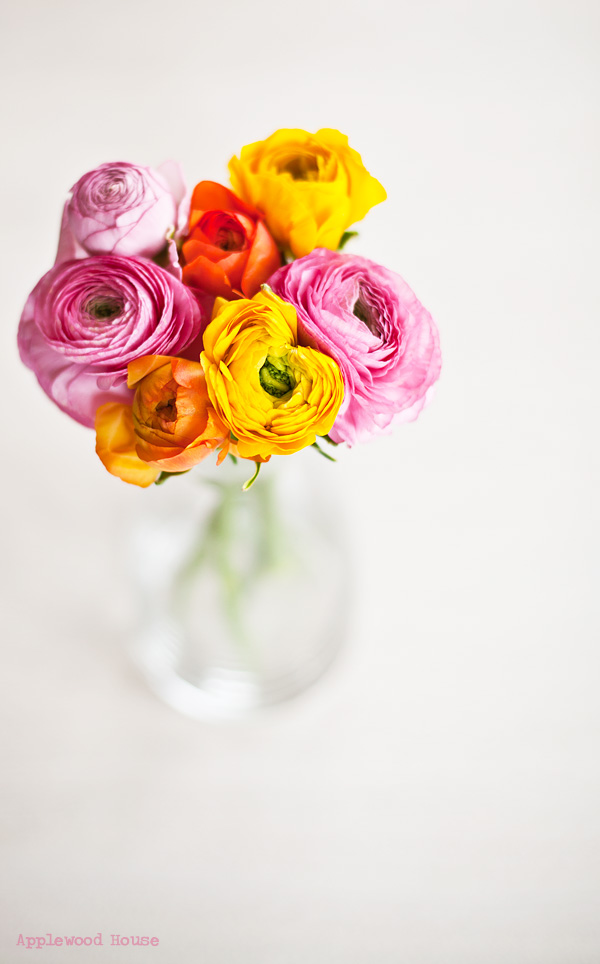 Die wunderschönen bunten Ranunkeln hier auf den Bildern habe ich mir selbst gekauft. Sie stehen auf unserem Esstisch und verbreiten ganz viel Frühlingsstimmung. Außer zu meinem Geburtstag bekomme ich von meinem Mann leider nie Blumen geschenkt, nicht mal zum Hochzeitstag. Das liegt aber daran, daß unser Hochzeitstag nur vier Tage nach meinem Geburtstag ist (ich sag nur, Wonnemonat Mai ♥) und die Geburtstagsrosen dann einfach noch so frisch sind und keine Konkurrenz neben sich dulden würden.